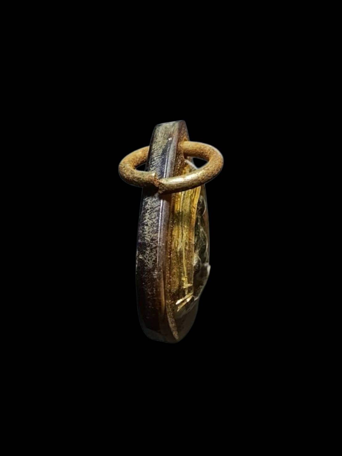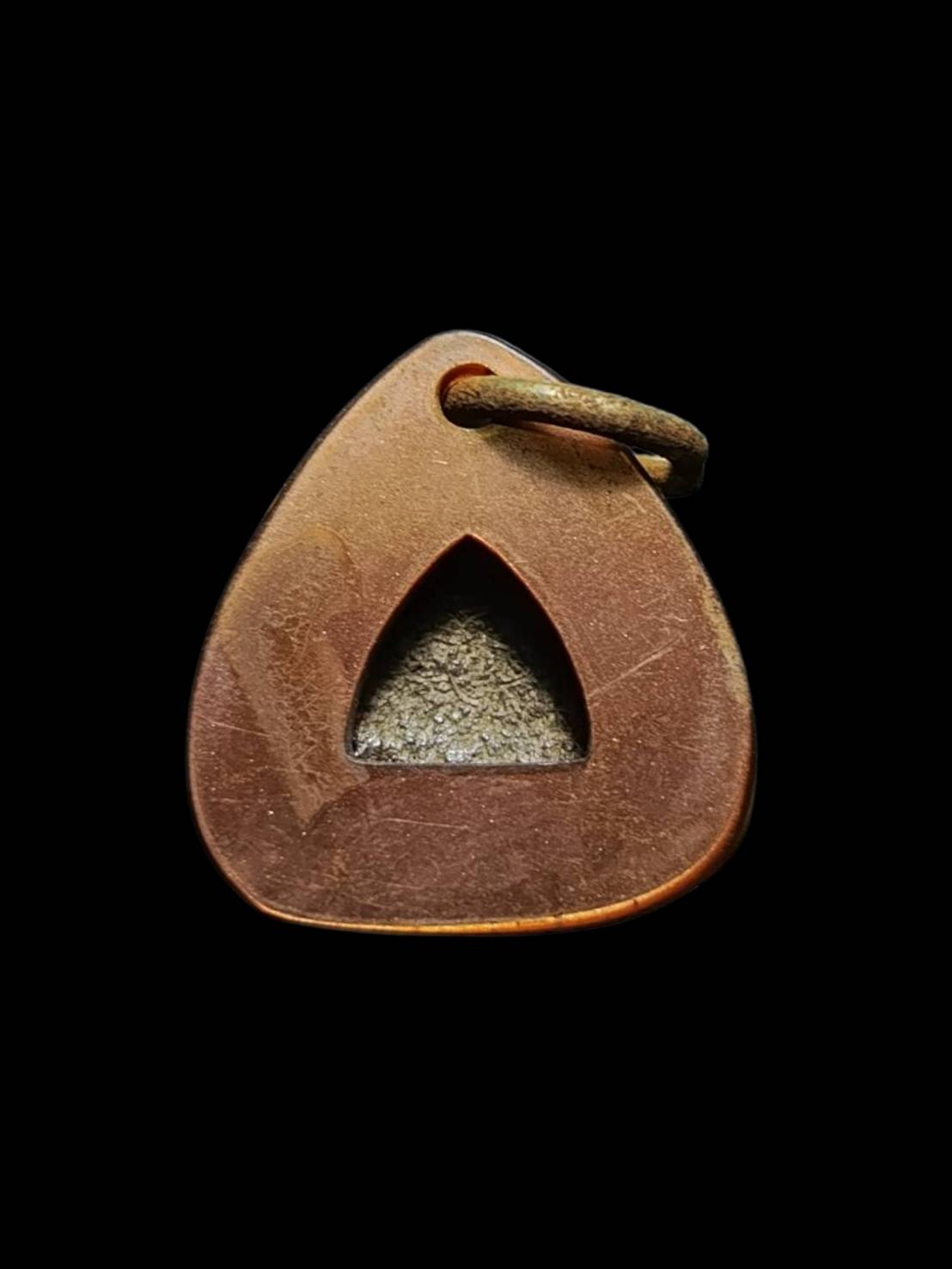 พระปิดตาเนื้อโลหะ เลี่ยมกรอบน้ำตาล ตัดหน้าหลัง เคาะเดียว |