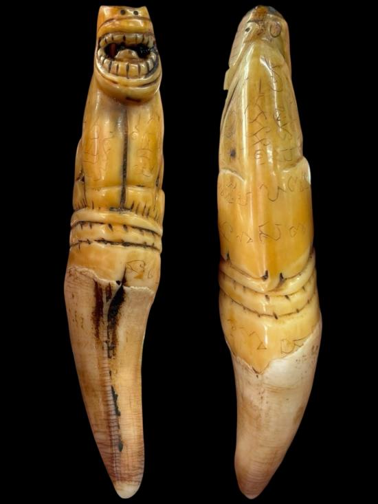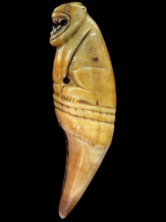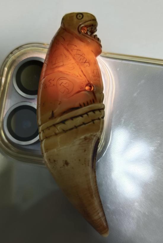รายละเอียด เขี้ยวหมีโปร่งฟ้า หลวงพ่อนก วัดสังกะสี จารยันต์ตุ๊กตา จารเต็มสูตร ยาว3นิ้ว อ้วนลำบึก