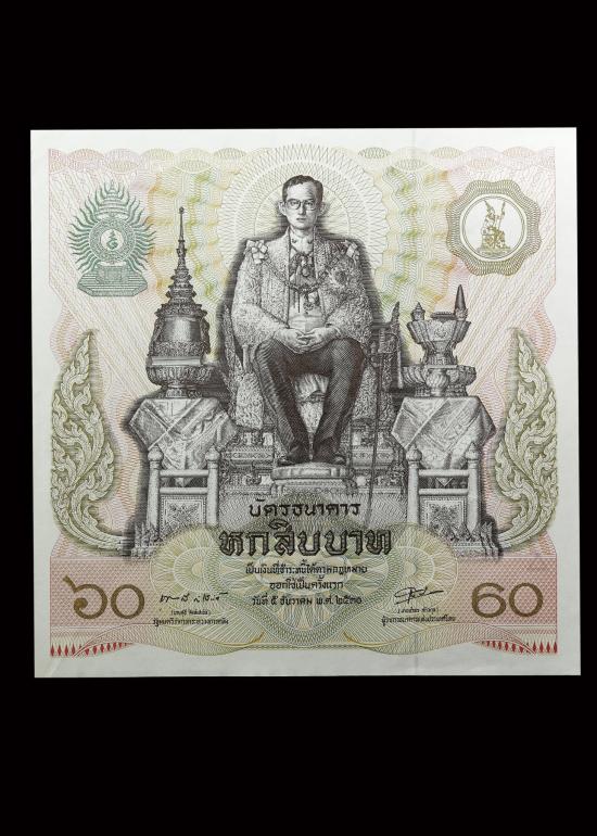 บัตรธนาคาร 60 บาท นั่งบัลลังก์ เนื่องในมหามงคล ทรงเจริญพระชนมพรรษา 60 บริบูรณ์ ปี2530 ไม่ผ่านใช้งาน เก่าเก็บในซองเดิม สภาพดี