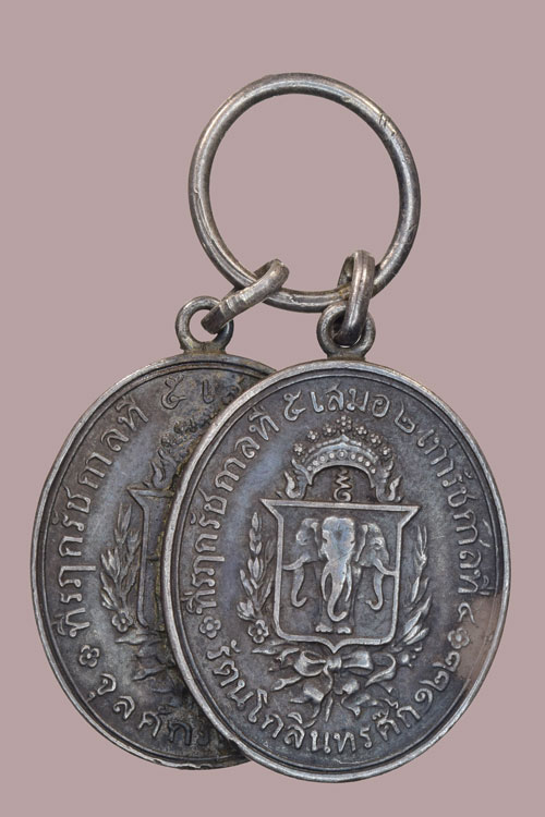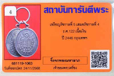 ชื่อพระเครื่อง วัดใจ...เหรียญ รัชกาลที่5 เสมอ รัชกาลที่4 ร.ศ.122 เนื้อเงิน ปี 2446 พร้อมบัตรรับรอง