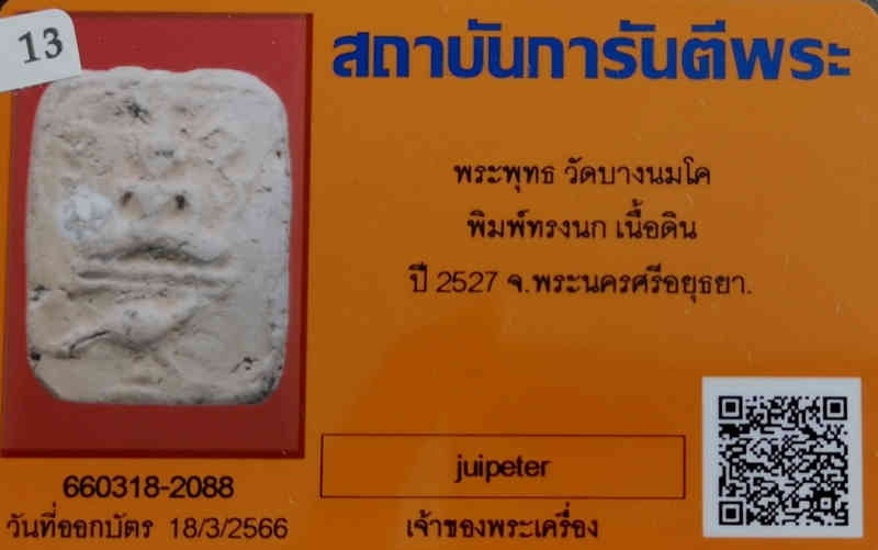 รายการนี้เป็นพระเนื้อดินเผาพิมพ์หลวงพ่อปานทรงนก วัดบางนมโค พระองค์นี้จัดสร้างในปี พ.ศ.2527 มีมวลสารเก่าของพระหลวงพ่อปานผสมอยู่เป็นจำนวนมาก ผงอุดเก่าตามสูตรโบราณ กำลังเป็นที่นิยม ใช้แทนพระหลวงพ่อปานยุคแรกองค์หลักแสน หลักล้านได้อย่างสบายใจ