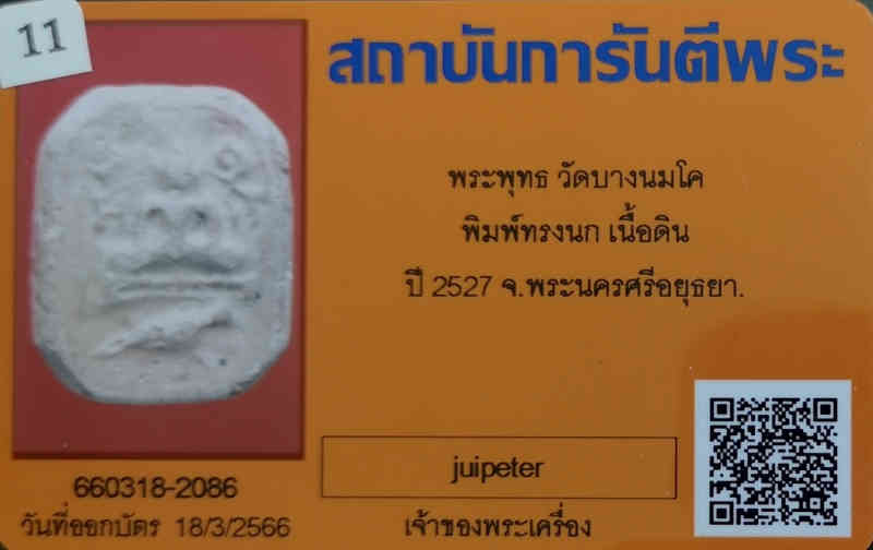รายละเอียด รายการนี้เป็นพระเนื้อดินเผาพิมพ์หลวงพ่อปานทรงนก วัดบางนมโค พระองค์นี้จัดสร้างในปี พ.ศ.2527 มีมวลสารเก่าของพระหลวงพ่อปานผสมอยู่เป็นจำนวนมาก ผงอุดเก่าตามสูตรโบราณ กำลังเป็นที่นิยม ใช้แทนพระหลวงพ่อปานยุคแรกองค์หลักแสน หลักล้านได้อย่างสบายใจ