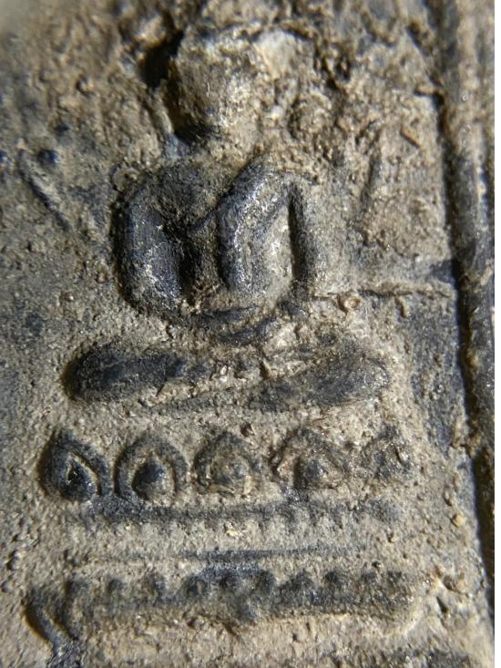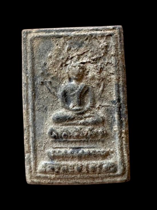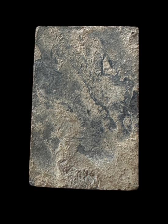 พระเนื้อผงเก่าองค์นี้เป็นพิมพ์สี่เหลี่ยมซุ้มล้อม เนื้อออกเทาดำ ดูเหมือนผ่านการเข้ากรุหรือโดนความชื้น ทำให้ผิวขึ้นคราบธรรมชาติอย่างชัด