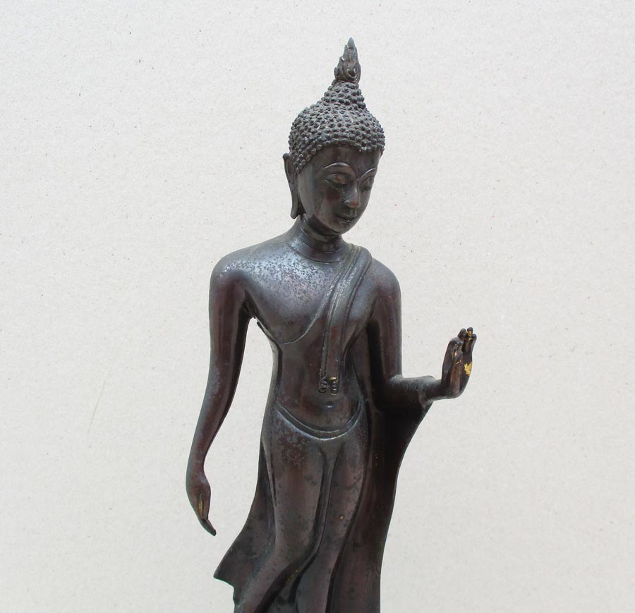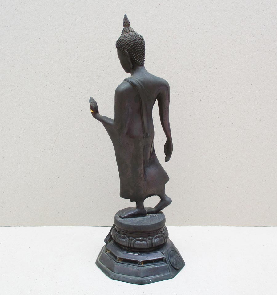 พระูพุทธปางลีลา รุ่น 3 โพธิ์ วัดอินทรวิหาร บางขุนพรหม กรุงเทพฯ พ.ศ.2530 สูงรวมฐาน 13 นิ้ว เนื้อโลหะรมมันปู ผิวแห้งหิ้ง สภาพสวย เข้มขลัง !!