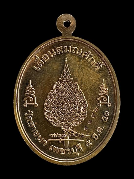 เหรียญเลื่อนสมณศักดิ์รูปไข่ครึ่งองค์ หลังพัดยศ เนื้อทองแดง หลวงพ่อตัด วัดชายนา 2551 |