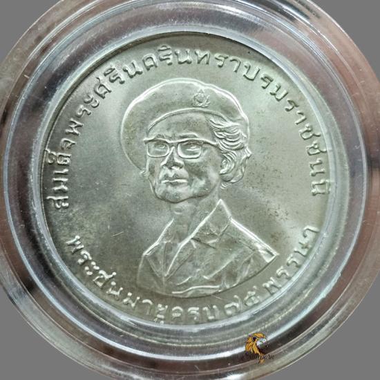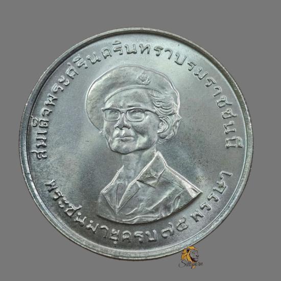 รายละเอียด 75 พรรษา สมเด็จพระศรีนครินทราบรมราชชนนี.ปีที่ผลิต: พ.ศ. 2518.ชนิด: เนื้อเงิน.สวยๆมีตลับ