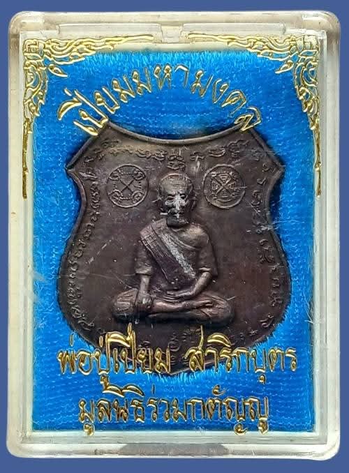 เหรียญอาร์ม "เปี่ยมมหามงคล" เนื้อทองแดงรมดำ พ่อปู่เปี่ยม สาริกบุตร มูลนิธิร่วมกตัญญู จัดสร้าง หลวงพ่อเกษม เขมโก สุสานไตรลักษณ์ จ.ลำปาง ปลุกเสก ปี ๒๕๓๗ กล่องเดิม |