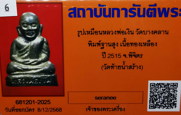 รูปเหมือนหลวงพ่อเงิน วัดบางคลาน พิมพ์ฐานสูง เนื้อทองเหลือง กริ่งดัง ปี2515 จ.พิจิตร (วัดท้ายน้ำสร้าง ) + บัตร G-pra สภาพเดิมค่ะ