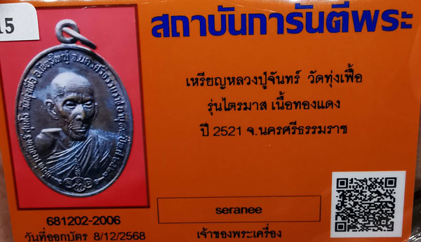 เหรียญหลวงพ่อท่านจันทร์ วัดทุ่งเฟื้อ รุ่นไตรมาส เนื้อทองแดง ห่วงเดิม ปี2521 จ.นครศรีธรรมราช + บัตรG-pra สภาพสวยเดิมค่ะ |