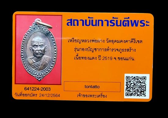 เหรียญหลวงพ่อผาง วัดอุดมคงคาคีรีเขต รุ่นตำรวจภูธรจัดสร้าง (ตุ้มหูยายซิ้ม) ปี2519 เนื้อทองแดง จ.ขอนแก่น พร้อมบัตรG