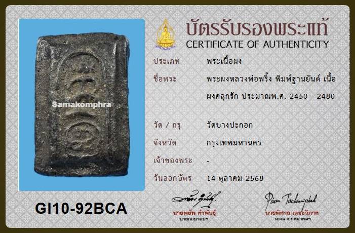 พระพุทธเนื้อผงคลุกรัก หลวงพ่อพริ้ง วัดบางประกอก พิมพ์ฐานยันต์ ปี2450-2480 หายากครับ