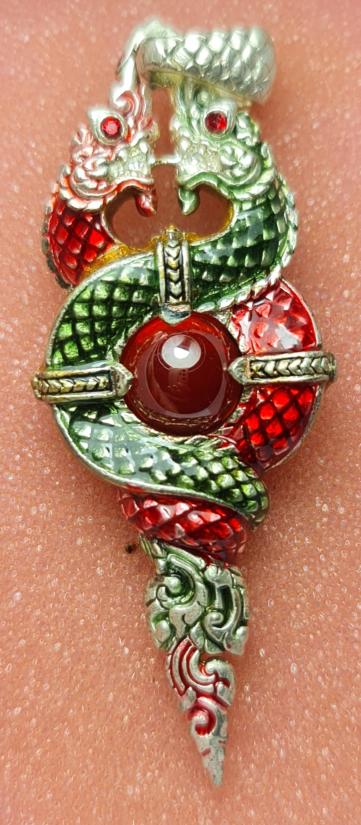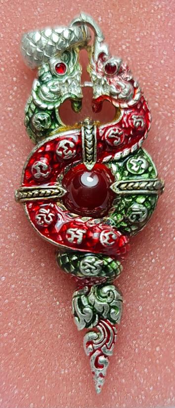 นาคเกี้ยวรวยทรัพย์ รุ่นยกฐานะ เนื้อกะไหล่เงินลงยา ตรงกลางฝังเพชรพญานาค |