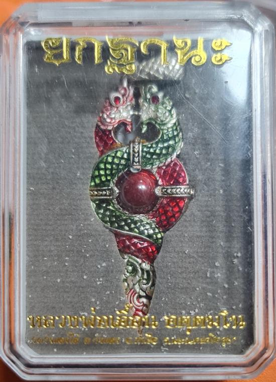 นาคเกี้ยวรวยทรัพย์ รุ่นยกฐานะ เนื้อกะไหล่เงินลงยา ตรงกลางฝังเพชรพญานาค พร้อมกล่องเดิมๆครับ |