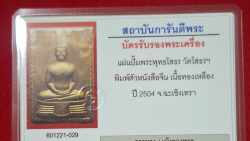 ชื่อพระเครื่อง แผ่นปั๊มพระพุทธโสธร วัดโสธร พิมพ์ตัวหนังสือจีน เนื้อทองเหลือง ปี 2504 จ.ฉะเชิงเทรา