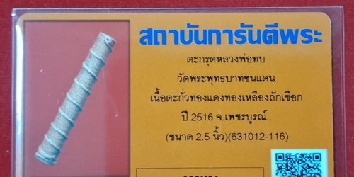 ตะกรุดหลวงพ่อทบ วัดพระพุทธบาทชนแดน เนื้อตะกั่วทองแดงทองเหลืองถักเชือก ปี 2516 จ.เพชรบูรณ์ ขนาด 2.5 นิ้ว |