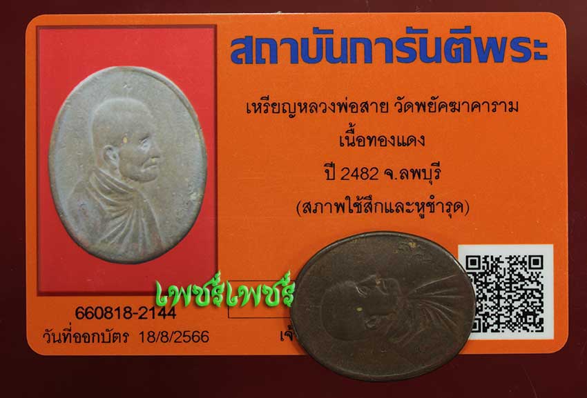 เหรียญ หลวงพ่อสาย วัดพยัคฆาราม เนื้อทองแดง ปี2482 จ.ลพบุรี สภาพกำลังน่าใช้ ยังคม หายาก พร้อมบัตรรับรองพระแท้จากการันตีพระสบายใจได้พระแท้แน่นอน ค่ะ