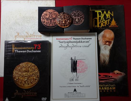 **เหรียญสุริยะภูมิจักรวาล สร้างโดยอาจารย์ ถวัลย์ ดัชนี (ศิลปินระดับโลก ฝีแปรงแบบเฉียบพลันและศิลปินเเห่งชาติ) เนื้อบรอนซ์ ผลงานมาสเตอร์พีส พร้อมอุปกรณ์ครบชุด กล่องใน-กล่องนอก,ใบเซอร์ลายเซ็นสด ถุง ซีดี