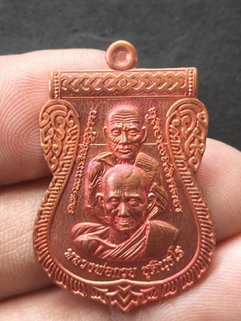 เหรียญพุทธซ้อนเหนือดวง เนื้อทองแดง ด้านหน้าหลวงปู่ทวดและหลวงพ่อกวย หลังท้าวเวสสุวรรณ โดยมีหลวงพ่อเล็ก วัดท่าขนุน ศิษย์หลวงพ่อฤาษีลิงดำ วัดท่าซุง อธิฐานจิต |