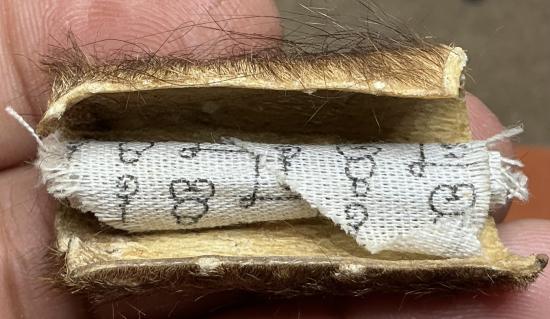 แดงที่ 120 บาท ตะกรุดหนังเสือสอดไส้ผ้ายันต์ชายธง ไม่ทราบที่ กว้าง 3 นิ้ว ยาว 4 นิ้ว |