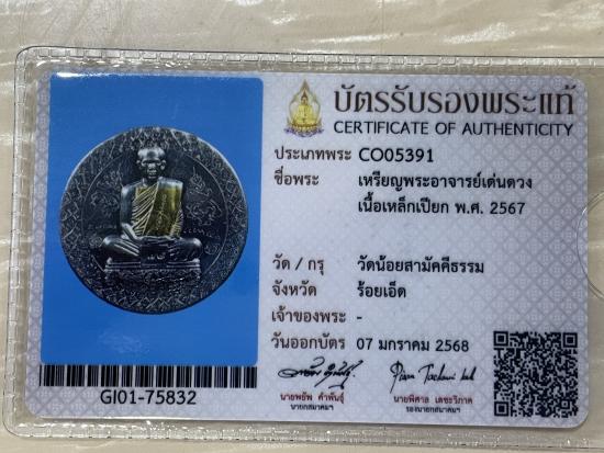 เหล็กเปียกหน้ากากทอง วัดน้อยสามัคคีธรรม สร้าง 99 เหรียญ ที่ระลึกรุ่นอธิการเด่นดวงเด่น จารเต็มหน้าหลังลายมือพระอาจารย์เด่นดวง พร้อมบัตรรับรองสมาคม