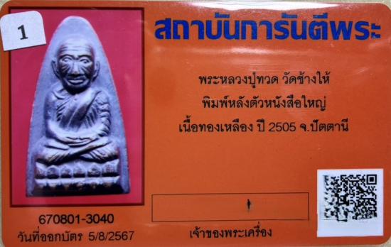เหรียญหลวงปู่ทวด เตารีดหลังหนังสือ พิมพ์ใหญ่ "ว" หัวตัน ปี 2505 พร้อมบัตรรับรอง