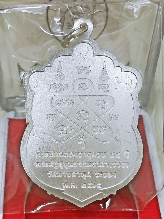 เหรียญเสมา ๘๘ ปี หลวงพ่อรวย อคฺคสาโร วัดมาบตาพูด จ.ระยอง เนื้อเงินลงยาจีวร หลังจารมือ หมายเลข 79