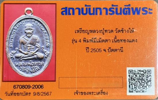 เหรียญหลวงปู่ทวด วัดช้างให้ พิมพ์เม็ดตา รุ่น 4 ปี 2505 พร้อมบัตรรับรอง