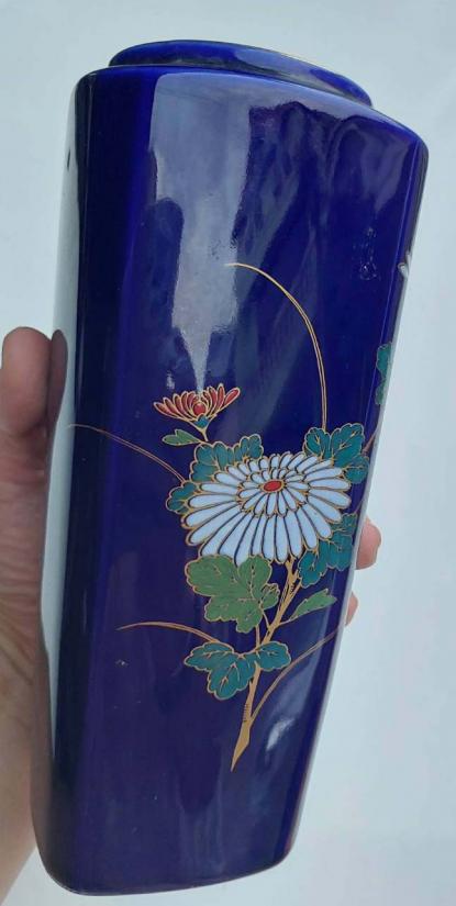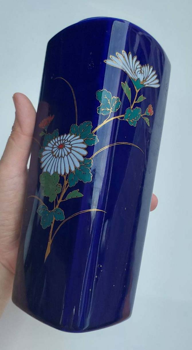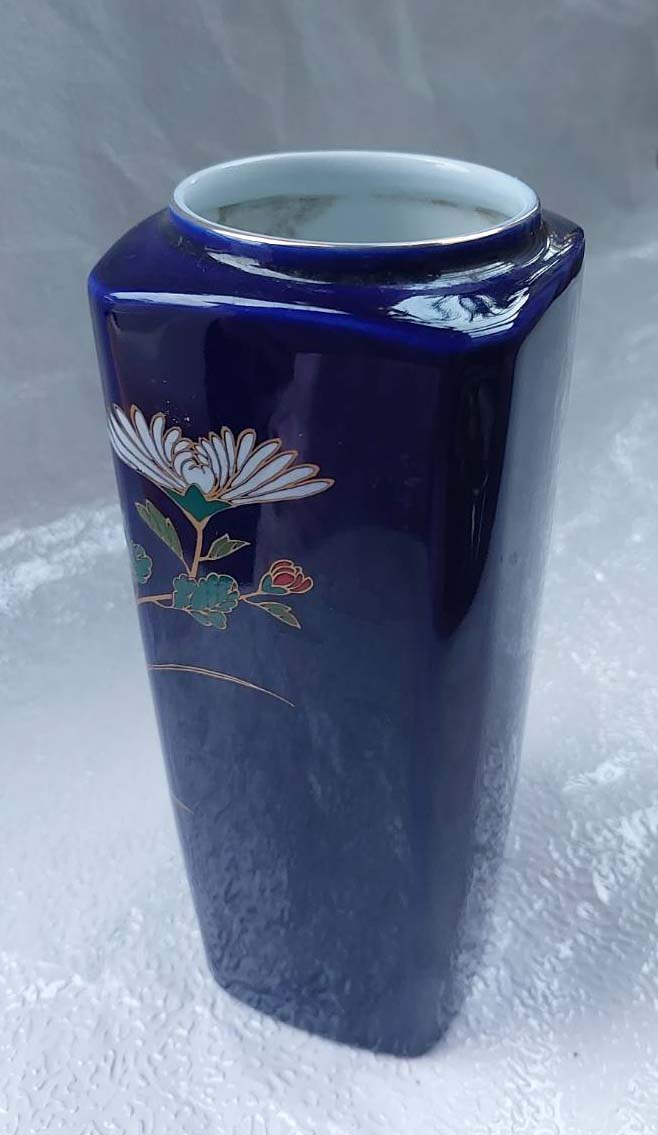 ***วัดใจ***แจกันสี่เหลี่ยมสีน้ำเงินโคบอลต์ของ Fukagawa (ฟุกากาวะ) ที่ผลิตในญี่ปุ่น ของสะสม ปากกว้าง 3 นิ้ว สูง 8 นิ้ว