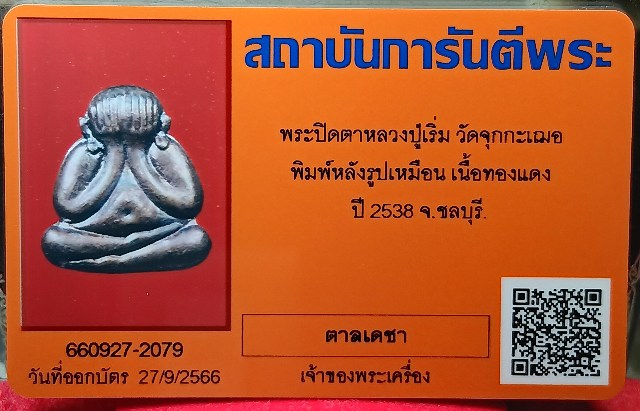 พระปิดตาหลังรูปเหมือน หลวงพ่อเริ่ม ปรโม (หลวงปู่เริ่ม) เนื้อทองแดง ปี2538 พระสวย ผิวเดิมๆ สภาพตามรูปเลยครับพร้อมบัตรการันตีพระ