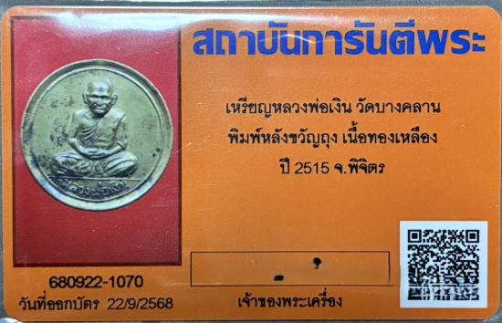 เหรียญหลวงพ่อเงิน วัดบางคลาน พิมพ์ขวัญถุง กะไหล่ทอง ปี 2515 พร้อมบัตรรับรอง