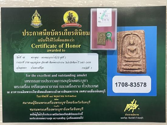 สร้างปี 2495 สภาพสวย สมบูรณ์ ไม่หักไม่ซ่อม รับประกันพระแท้ ดูง่าย ใบประกาศรางวัลที่3งานสมาคม
