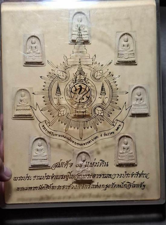 พระสมเด็จ9แผ่นดิน พิมพ์พระประธานพระอุโบสถพระอารามหลวงประจำ 9 รัชกาล สมเด็จญาณสังวรฯ เป็นประธาน ในหลวงรัชกาลที่ 10 ประธานมในพิธี สมเด็จพระเทพทรงพระสุหร่าย และเจิมพิมพ์ พร้อมกดพิมพ์ปฐมฤกษ์ จัดสร้างในวาระในหลวงรัชกาลที่ 9 ทรงมีพระชนมพรรษาครบ 6 รอบ ในปี2542 รายละเอียดที่กล่องครบ