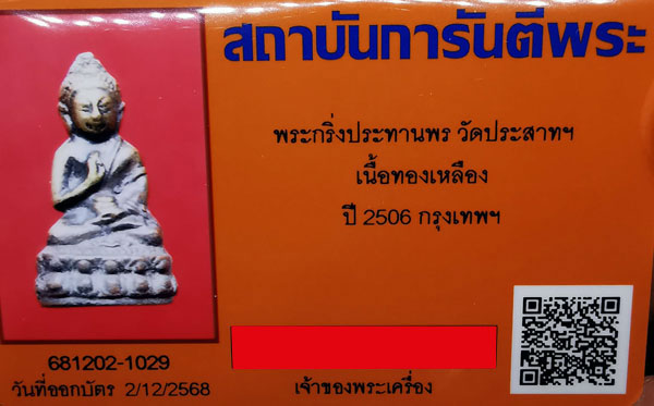 พระกริ่งประทานพร วัดประสาทฯ เนื้อทองเหลือง กริ่งขัด ปี2506 จ.กรุงเทพฯ + บัตรG-pra สภาพเดิมค่ะ สภาพตามรุปทุกประการค่ะ