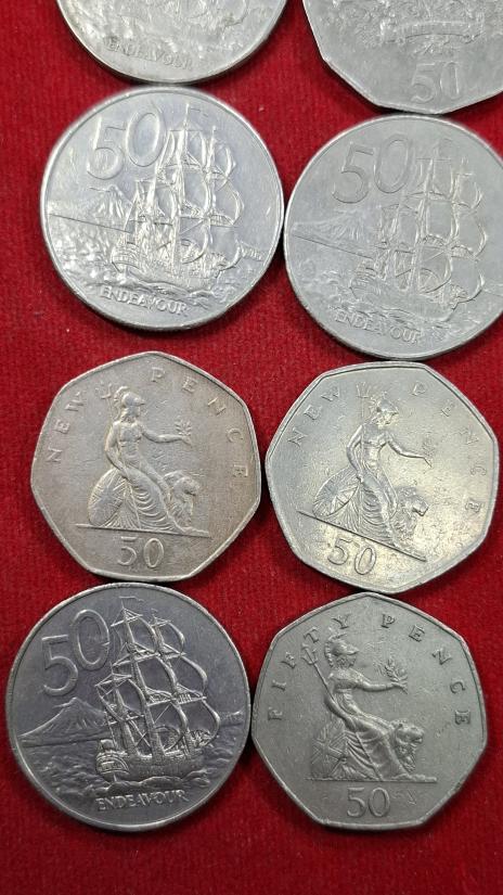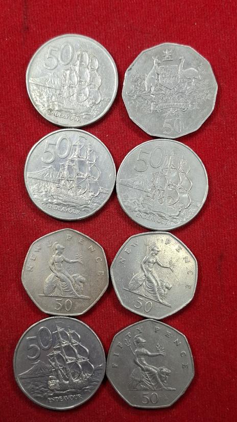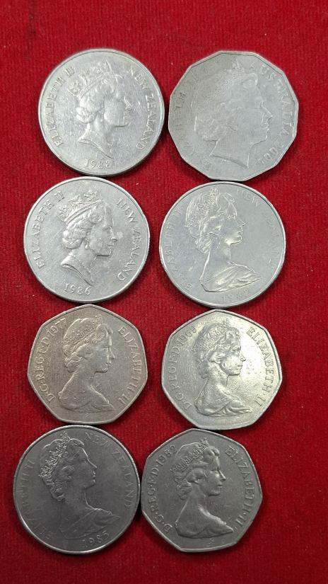 เหรียญ 50 เพนซ์ อังกฤษ +เหรียญ 50 เซนต์ของนิวซีแลนด์+เหรียญ 50 เซนต์ของออสเตรเลีย ทั้งหมด 8เหรียญ