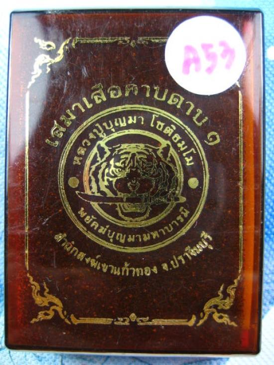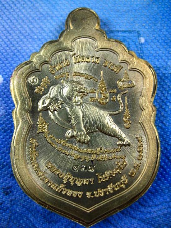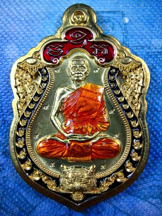 เหรียญรุ่นเสมาเสือคาบดาบ 1 หลวงปู่บุญมา โชติธมโม สำนักสงฆ์เขาแก้วทอง เนื้อทองทิพย์ไม่ตัดปีก ตอก ๙ รอบ ลงยาขอบกนก ลงยาจีวร (---A53---) |