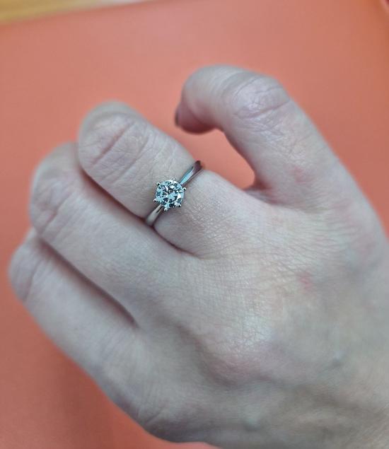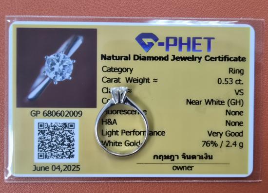 แหวนเพชรแท้เม็ดเดี่ยวชู 0.53 Ct. ตัวเรือน white Gold 76% เบอร์ 52 (พร้อมบัตรรับรองสถาบันการันตีเพชร)
