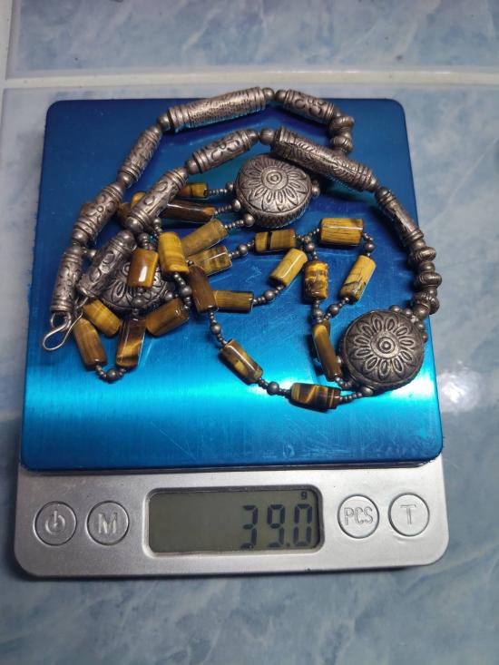 สร้อยบุเงินสลับหินไทเกอร์สวยๆ น้ำหนักรวมชั่งได้ 39 กรัม สำหรับสตรีใส่ครับ
