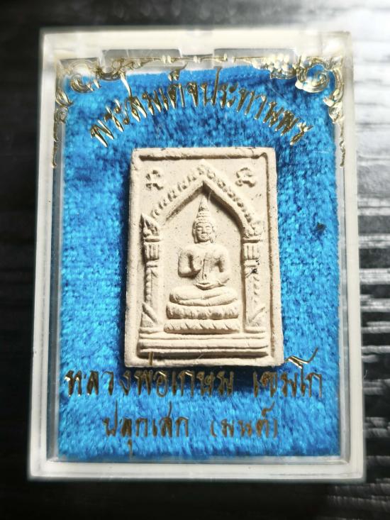 สร้างตั้งแต่ปี 2529 ด้วยผงพุทธคุณอิทธิเจวิเศษ ของพระคณาจารย์ และพระเกจิอาจารย์ ผู้ทรงคุณวุฒิ อิทธิฤทธิ์ และบุญฤทธิ์ปาฏิหาริย์ แกกล้าในวิชาอาคม มีชื่อเสียงโด่งดังเป็นที่นิยมยกย่องในความขลังศักดิ์สิทธิ์ ตั้งแต่สมัยโบราณจนถึงปัจจุบัน พระสมเด็จประทานพร หลวงพ่อเกษมเขมโก มี 2 พิมพ์คือ พิมพ์เล็ก และ พิมใหญ่ จำนวนพิมพ์ละ 5000 องค์ ส่วนองค์ที่โชว์นี้เป็นพิมพ์เล็ก ขนาดพอๆกับพระวัดปากน้ำ สร้างโดยพระอาจารย์สมุห์เลี้ยง วัดไตรมิตรวิทยาราม เมื่อปี 2530 เพื่อหารายได้ไปสมทบทุนสร้างกุฏิอนุสรณ์พระวิสุทธาธิบดี ณ วัดบางนาง อ.พานทอง จ.ชลบุรี ฉะนั้นพระสมเด็จประทานพร ทั้งพิธิกรรมการสร้าง พิธีกรรมด้านวัตถุมงคล พิธีกรรมปลุกเสก ได้ทำถูกต้องตามตำราและแบบแผนการสร้าง พระของโบราณ คณาจารย์เป็นอย่างดีที่สุด จึงนับว่าเป็นวัตถุมงคลอันสูงสุด ที่สาธุชนทั่งไปมีไว้ติดตัว เพื่อความเป็นสวัสดิมงคลแก่ชีวิต และเพื่อให้เกิดประสิทธิภาพแห่งอานุภาพพุทธคุณ เป็นความขลังความศักดิ์สิทธิ์อิทธิฤทธิ์ปาฏิหาริย์แก่ผู้บูชานั้น ควรปฏิบัติดังนี้ ก่อนจะนอนหรือก่อนจะออกจากบ้านไปทำธุรกิจ ควรนำพระสมเด็จประทานพร ขึ้นพนมมือแล้วตั้งจิตให้เป็นสมาธิ นึกว่าพระอยู่ที่ใจ และภาวนาว่า อะระหัง พุทโธ นะ ชาลีติ หลายๆครั้ง ให้เป็นภาวนาสมาธิ จะปฏิบัติได้มากหรือน้อย ให้ขึ้นอยู่กับความสะดวกและโอกาส พระสมเด็จประทานพร จะแผ่อานุภาพหนุนดวงชะตา เสริมวาสนาบารมีผู้บูชา ให้ประสบความสุข ความเจริญรุ่งเรืองในชีวิต ทั้งด้านอาชีพการงานและฐานะสัมฤทธิ์ผลสมความปรารถนา และประสบมหาโชคลาภ มีเสน่ห์เมตตามหานิยมสูง แคล้วคลาดอุปสรรคอันตราย ทั้งปวง โดยใช้มวลสารในการสร้างประกอบด้วย ผงวิเศษ 16 ชนิด คือ