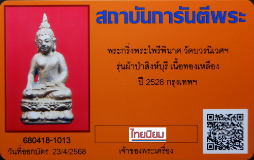 รายละเอียด พระกริ่งไพรีพินาศ เนื้อทองเหลือง(ลำอู่) ปี2528 วัดบวรฯ รุ่นผ้าป่าสิงห์บุรี + บัตรรับรอง G-PRA