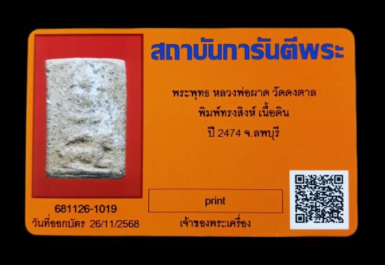 พระหลวงพ่อผาด วัดดงตาล พิมพ์ทรงสิงห์ ปี๒๔๗๔ (หลวงพ่อปาน ปลุกเสก) พร้อมบัตรรับรอง ครับ
