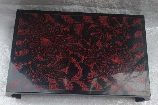 แท่นวางพระ โต๊ะญี่ปุ่นโบราณหรือ "ซาทาคุ" (Zataku) ที่ทำจากไม้และตกแต่งด้วยเทคนิคการลงรักปิดทอง (Makie) ที่มีลวดลายดอกไม้สีแดงบนพื้นสีดำ สินค้ามือสองมีรอยตามการ