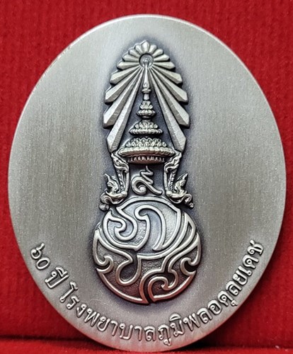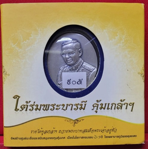 เหรียญในหลวง ร.9 เนื้อเงิน สร้างในวาระ 60 ปี โรงพยาบาลภูมิพลอดุลยเดช ปี 2552 ตอกหมายเลข ๙๐๕ พร้อมกล่องเดิม รายได้ทูลเกล้าถวายพระบาทสมเด็จพระเจ้าอยู่หัว รัชกาลที่ 9 จัดสร้างศูนย์มะเร็ง และสนับสนุนกองทุนคุ้มเกศ