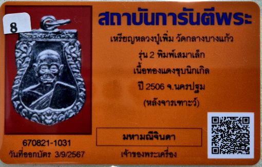 เหรียญรุ่น 2 เสมาเล็ก หลวงปู่เพิ่ม วัดกลางบางแก้ว เนื้อทองแดงชุบนิเกิ้ล ปี 2506 สวยแชมป์ พร้อมบัตรรับรองครับ