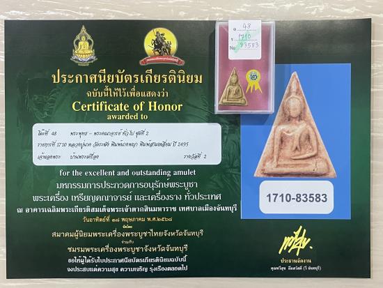 สร้างปี 2495 สภาพสวย สมบูรณ์ ไม่หักไม่ซ่อม รับประกันพระแท้ ดูง่าย ใบประกาศรางวัลที่2งานสมาคม