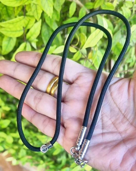 สร้อยคอคล้องพระเชือกร่มตอกหมุดหนาแน่น สวมหัวได้ คล้องพระได้ 2 องค์ ( หน้า - หลัง ) ขนาดเชือกร่มอย่างหนา 4 มิล ตะขอแข็งแรงทนทาน ( ของใหม่ ) ยาว20 นิ้ว