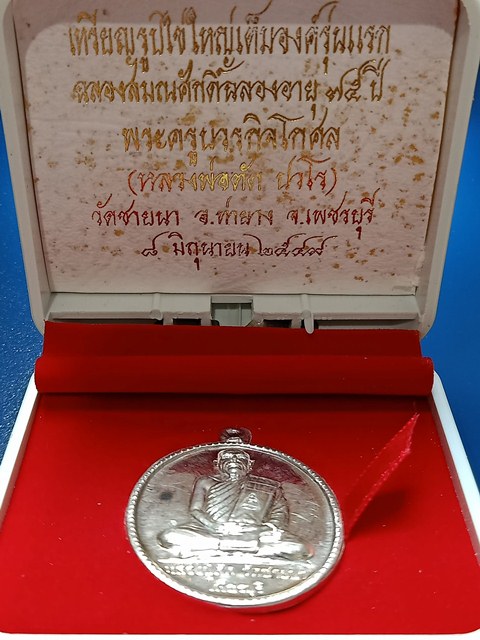 เหรียญฉลองอายุครบ 75 ปี หลวงพ่อตัด วัดชายนา ปี 49 เนื้อเงินหลังยันต์ (สร้าง 499 เหรียญ) ผิวเดิมๆ เคาะเดียวแดงครับ