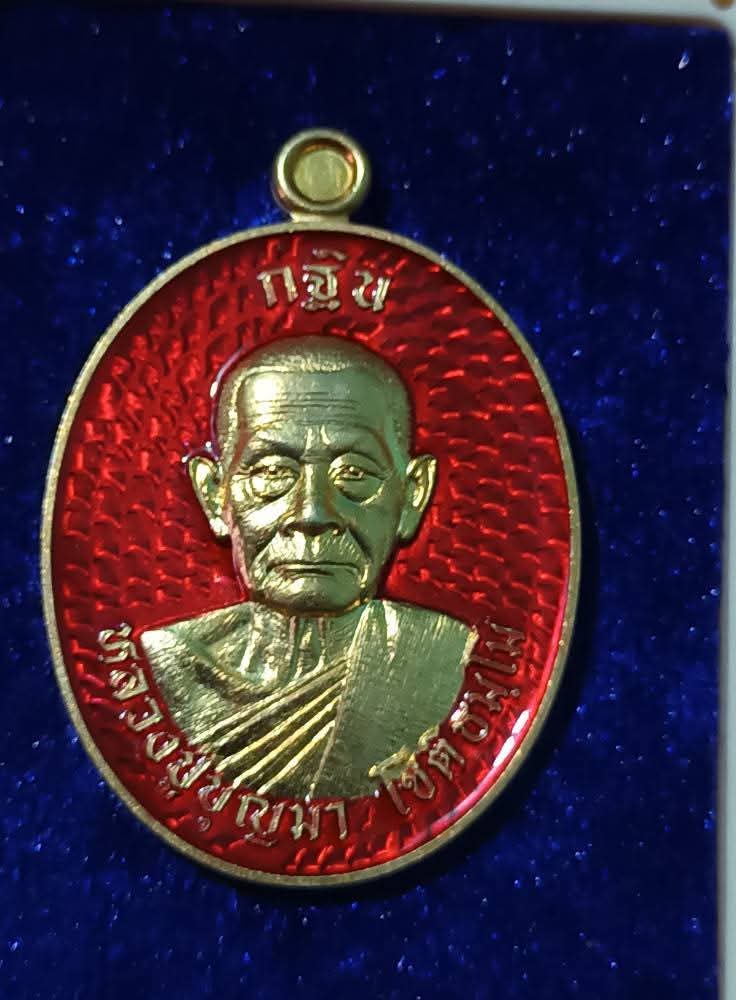 เนื้อชุบทอง ลงยาแดง พร้อมกล่องเดิม No.394 เหรียญกฐินรุ่นสุดท้ายหลวงปู่