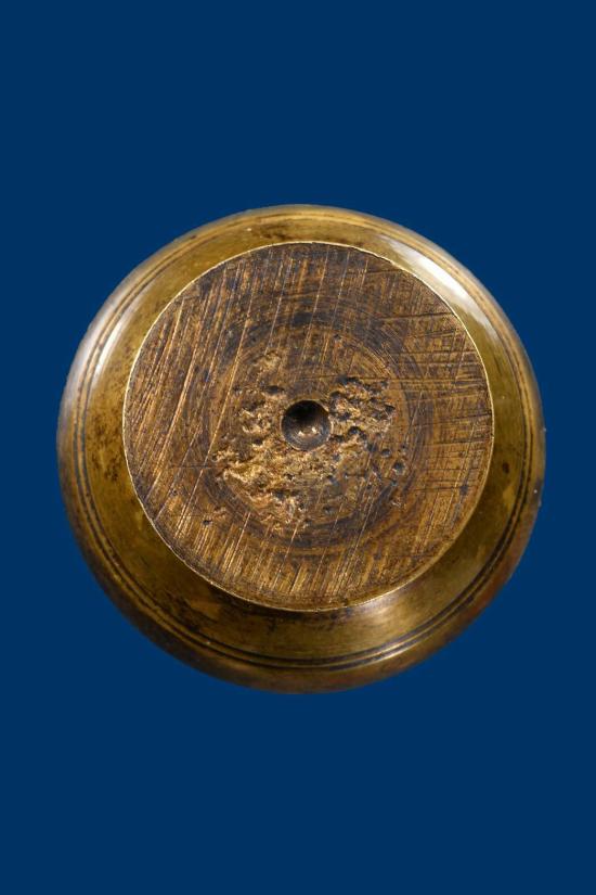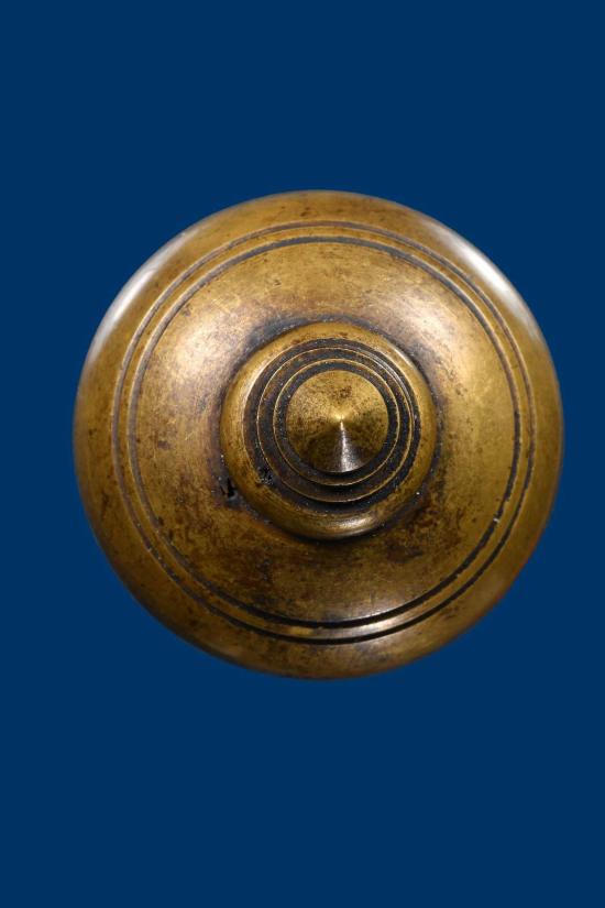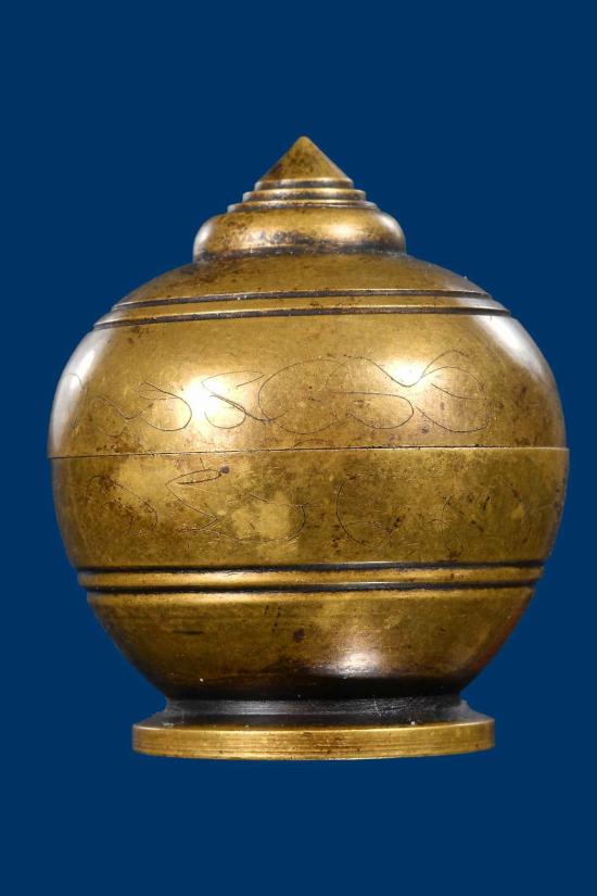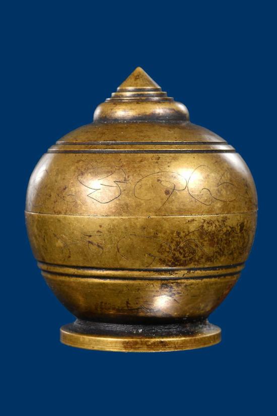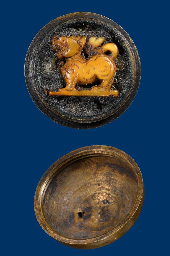 **ตลับสีผึ้งทองเหลืองโบราณพร้อมสิงห์สามขวัญเนื้องาแกะเก่า**