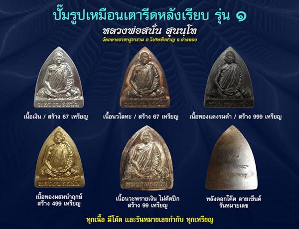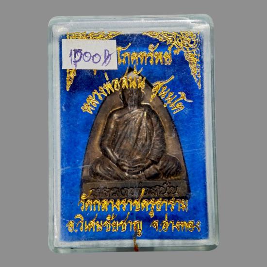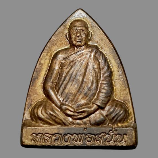ปั๊มรูปเหมือนเตารีดหลังเรียบ หลวงพ่อสนั่น รุ่นแรก ปี2553 เนื้อทองผสมนำฤกษ์ หลังตอกโค้ดลายเซ็นต์ หมายเลข 405 (กล่องเดิม)