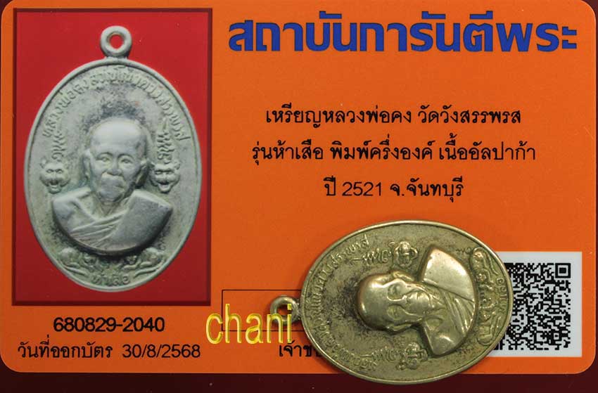 เหรียญ หลวงพ่อคง วัดวังสรรพรส รุ่นห้าเสือ เนื้ออัลปาก้า ปี2521 จ.จันทบุรี สภาพเดิมๆ อุดกริ่ง กริ่งดังไม่ติดขัด พร้อมบัตรรับรองพระแท้จากการันตีพระสบายใจได้พระแท้แน่นอน ค่ะ